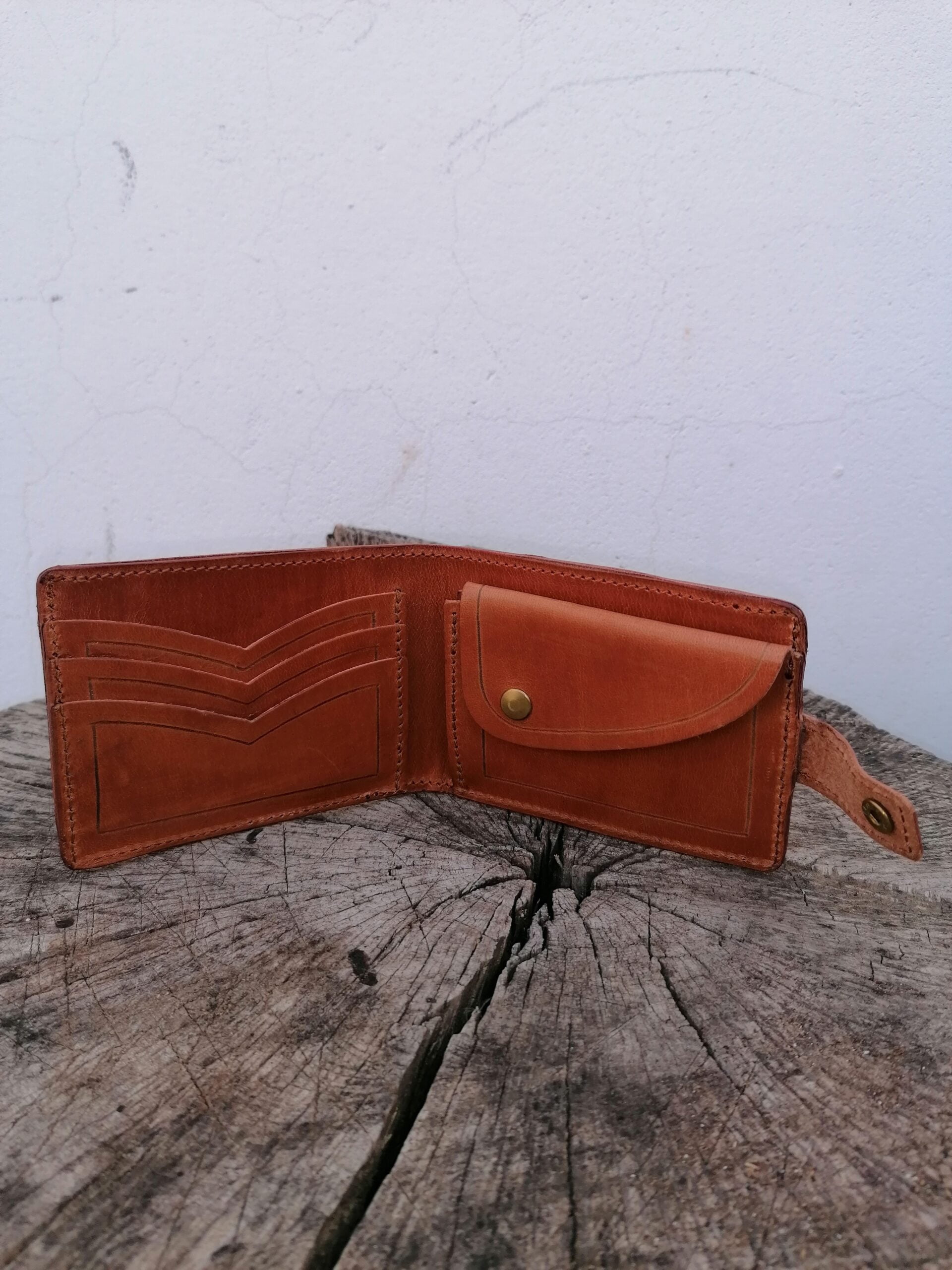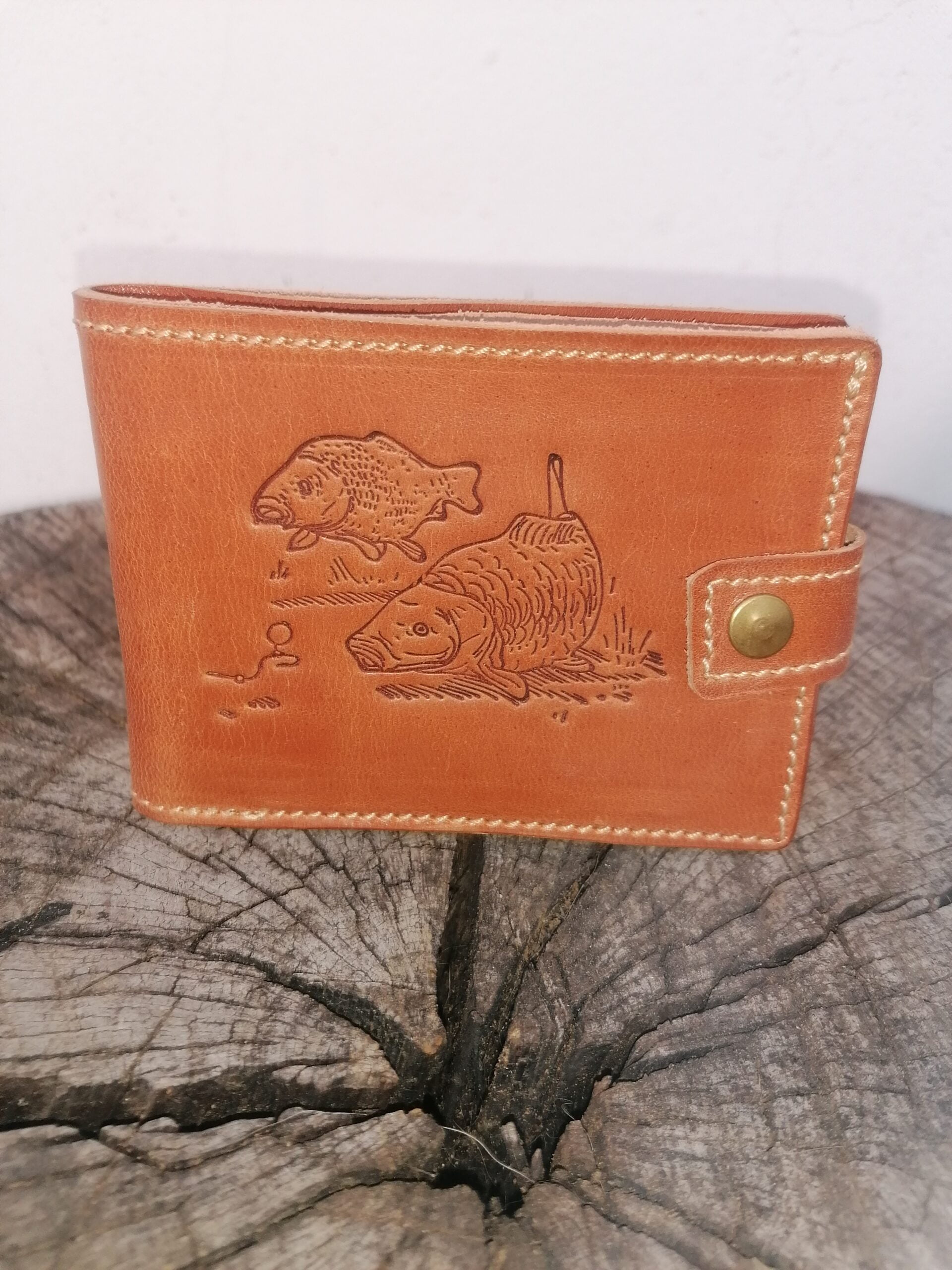 Cartera tipo americana de cuero de potro , con grabado de carpa , con tarjetero ,billetero y monedero