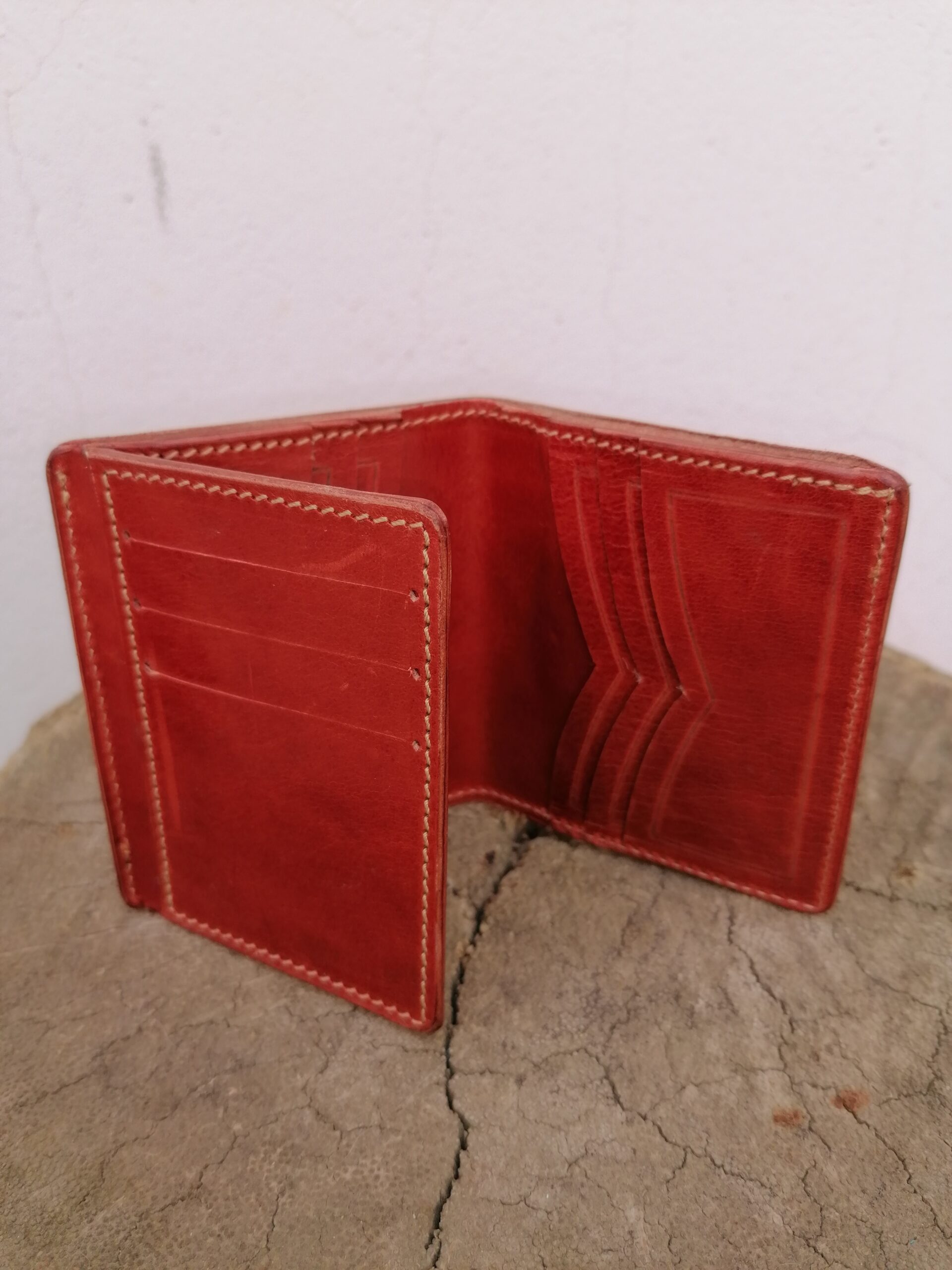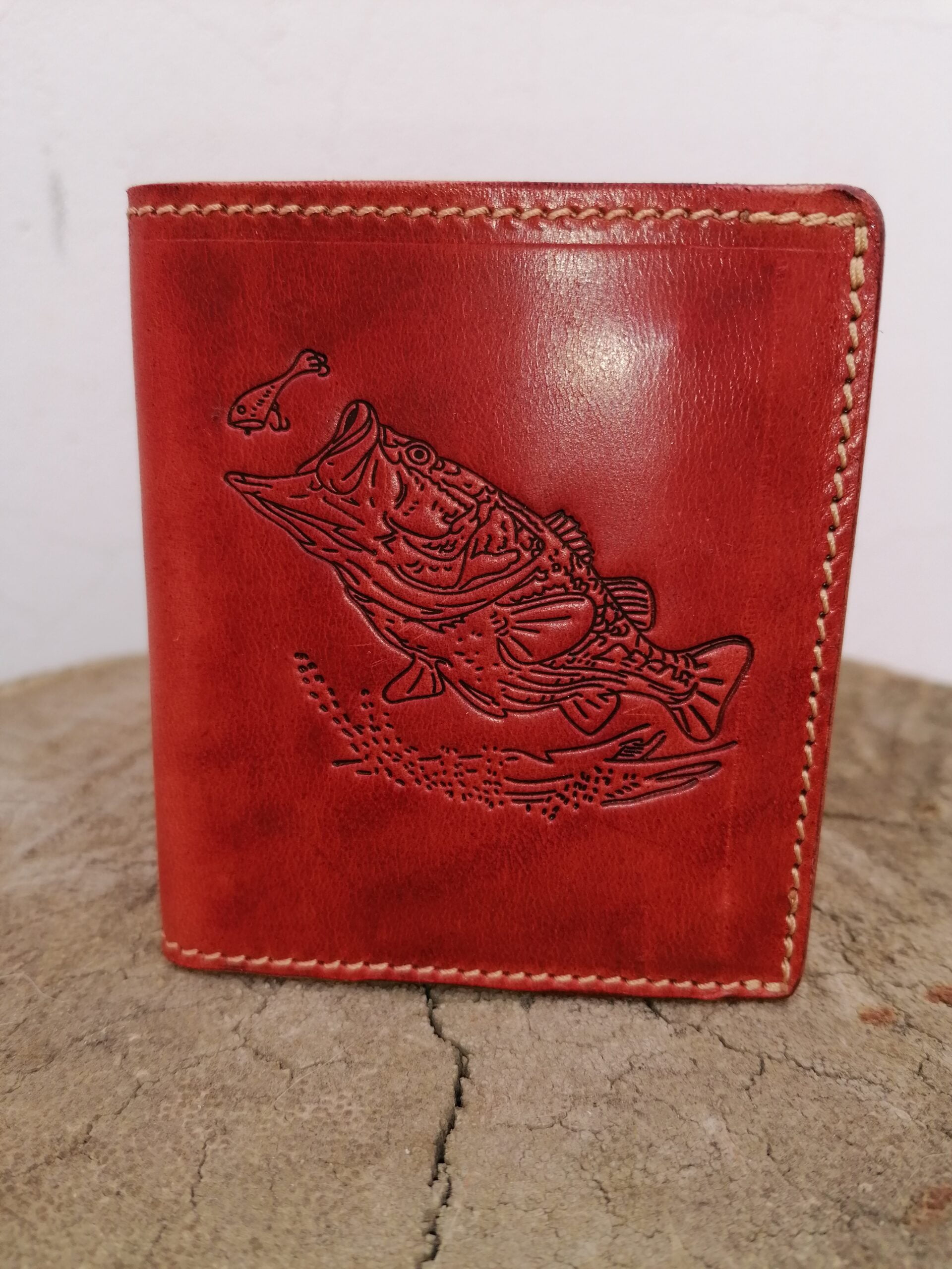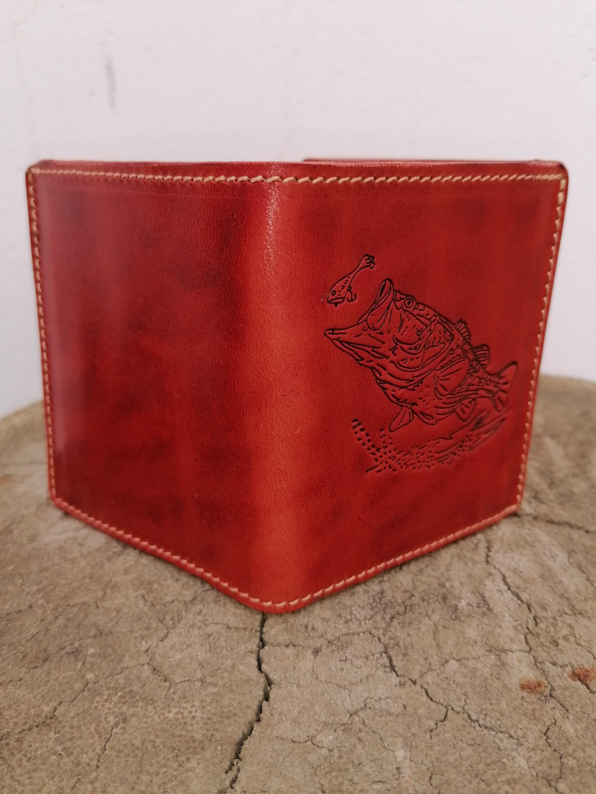 Cartera hecha en cuero de potro con grabado de bass , con apartados para 10 tarjetas, con solapa lateral y billeteros