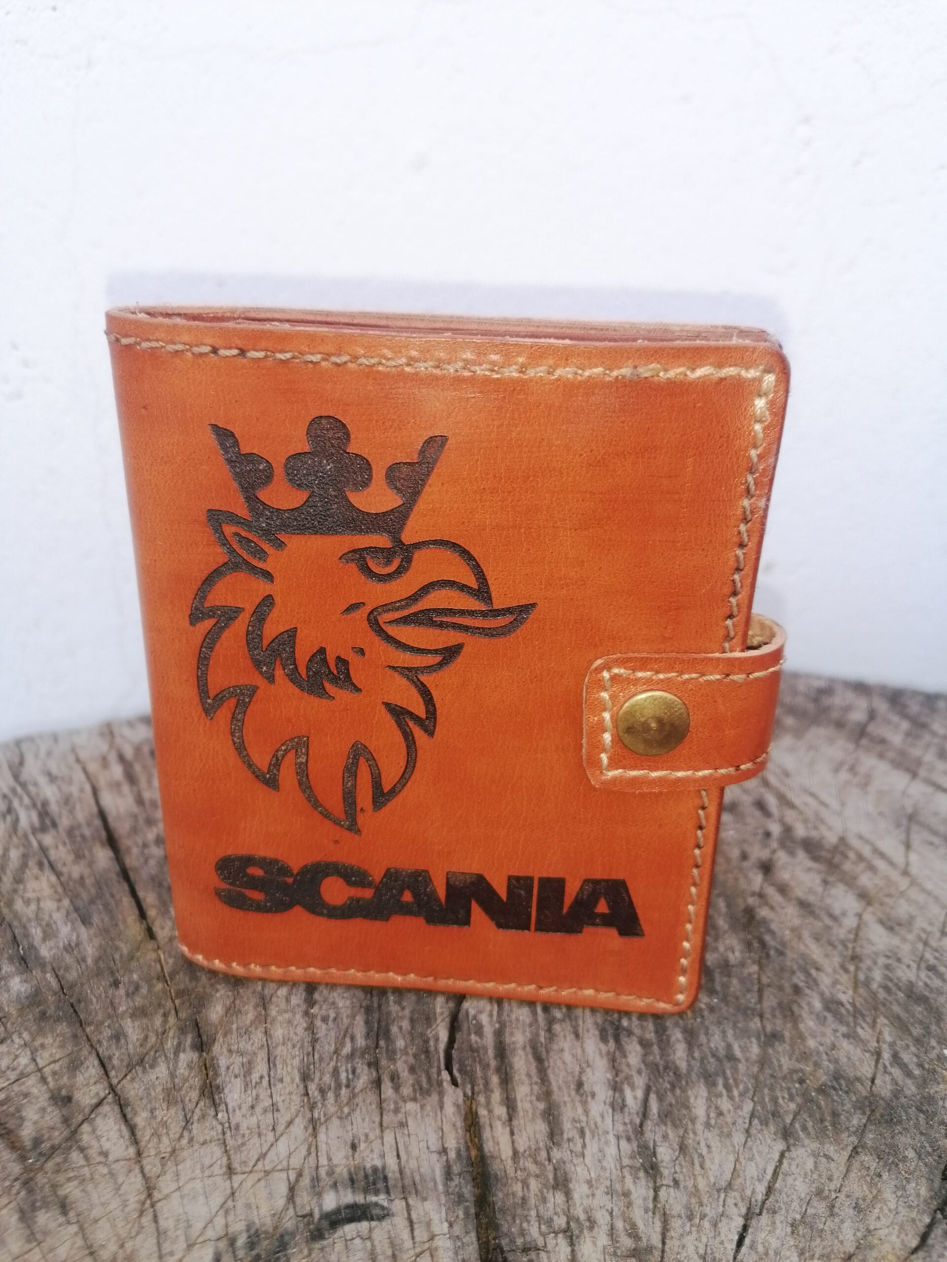 Cartera de cuero de potro , con nombre y logo de Scania , con tarjetero ,billetero y monedero.