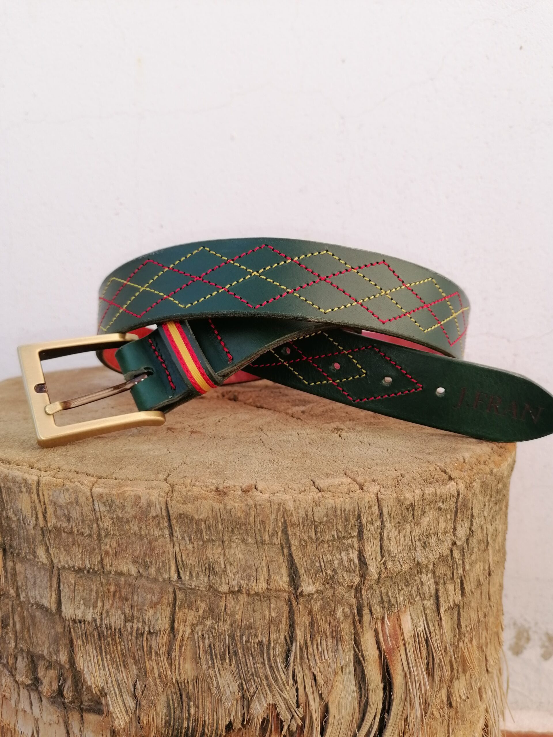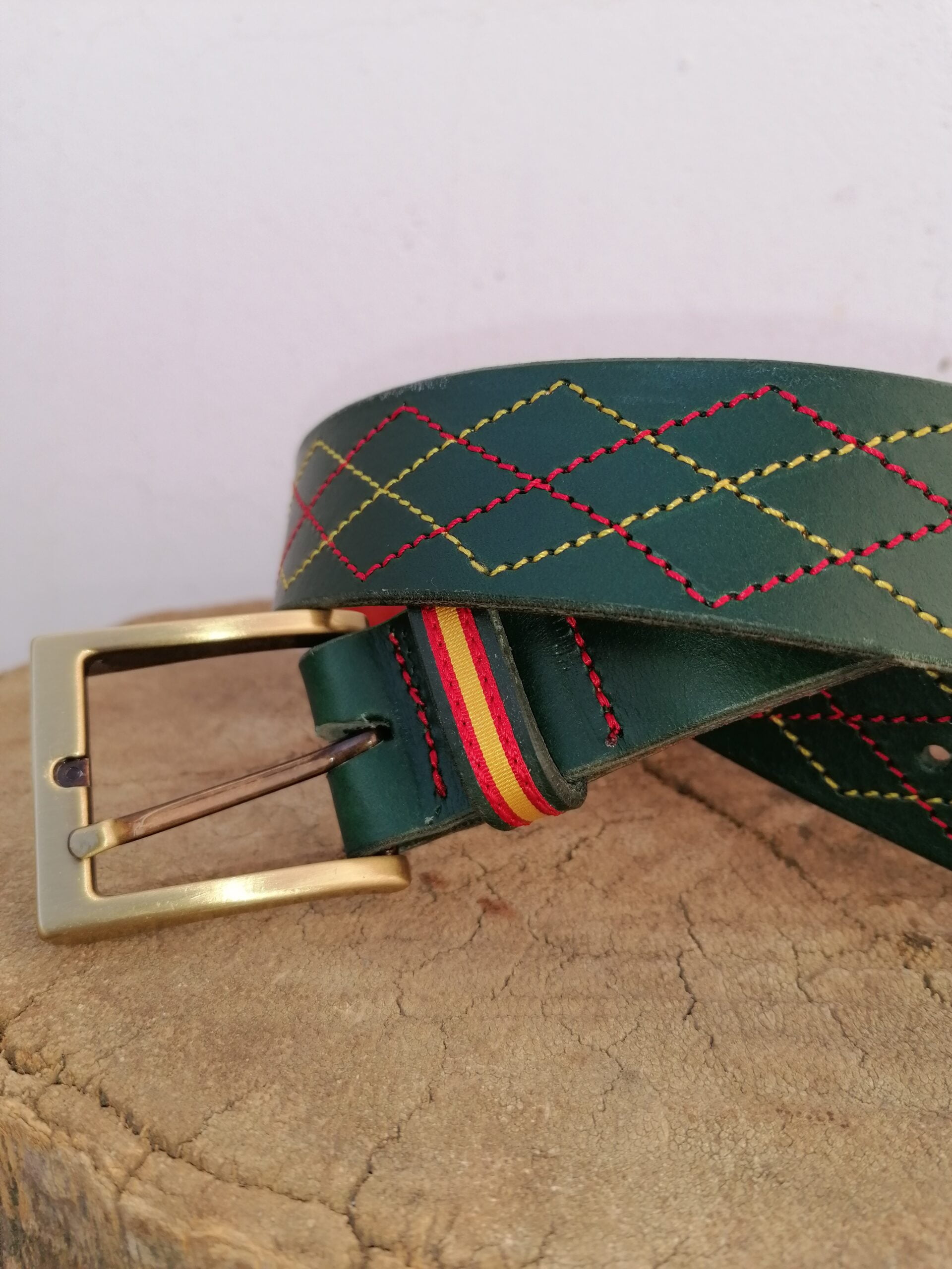 Cinturón en cuero cuello de ternera de 3,5 mm color verde con cosido rombos en hilo amarillo y rojo y trabilla bandera de España