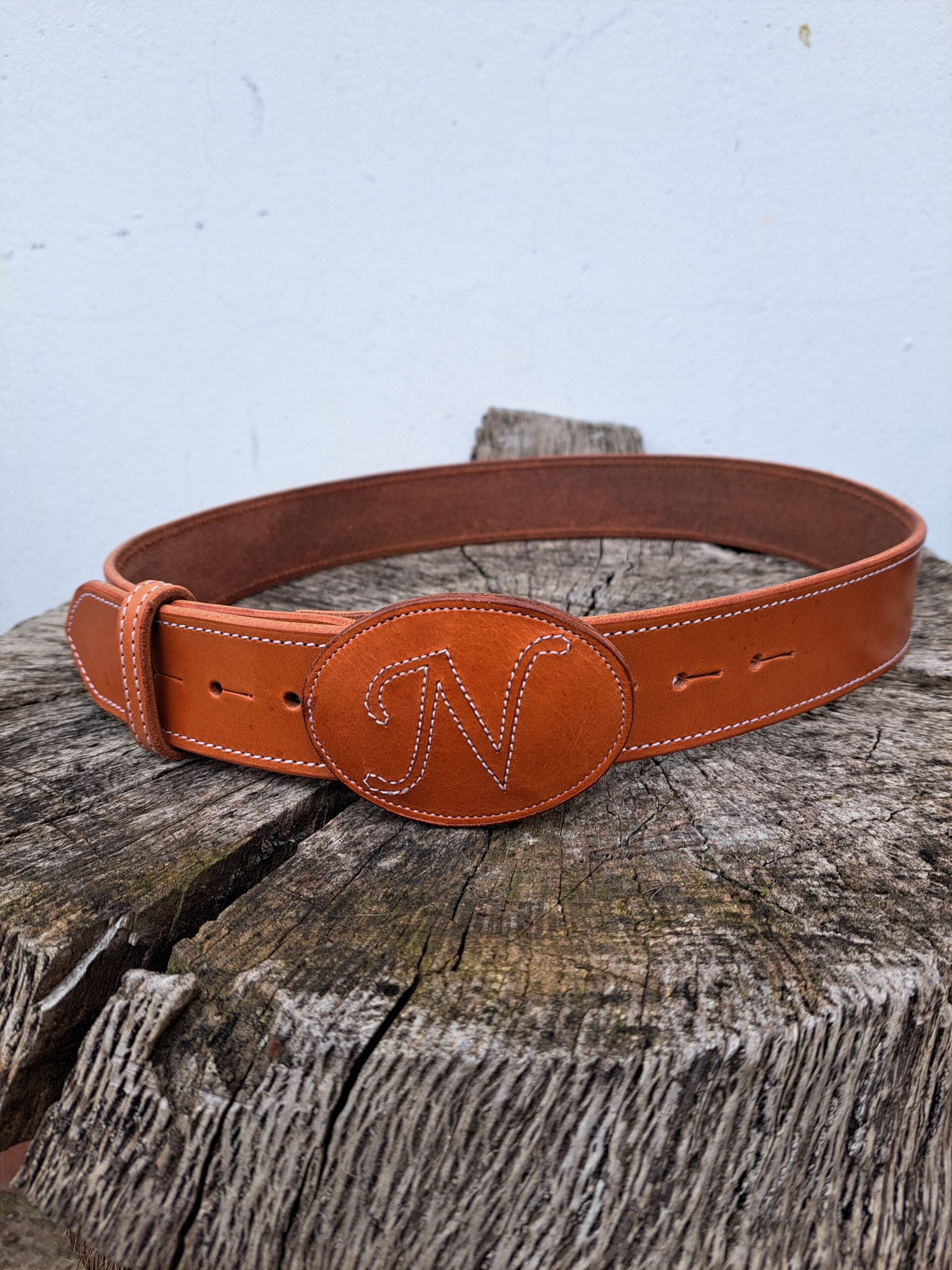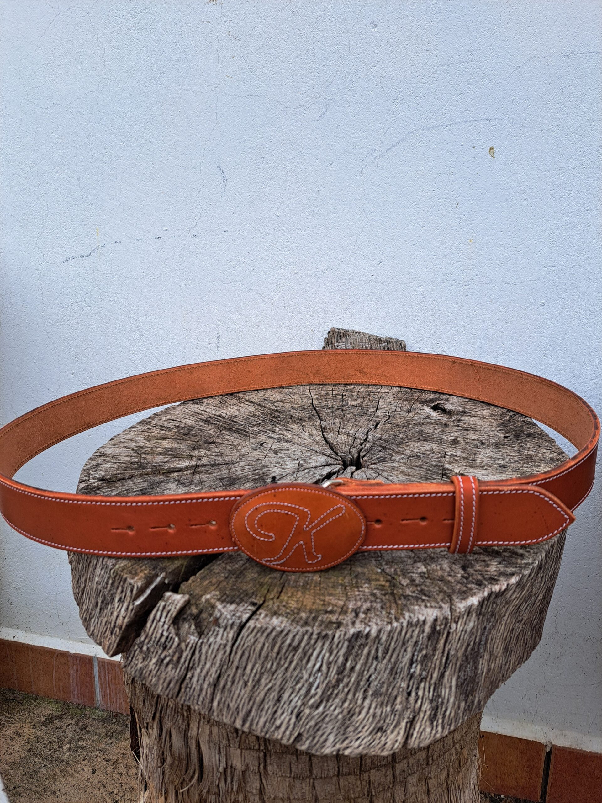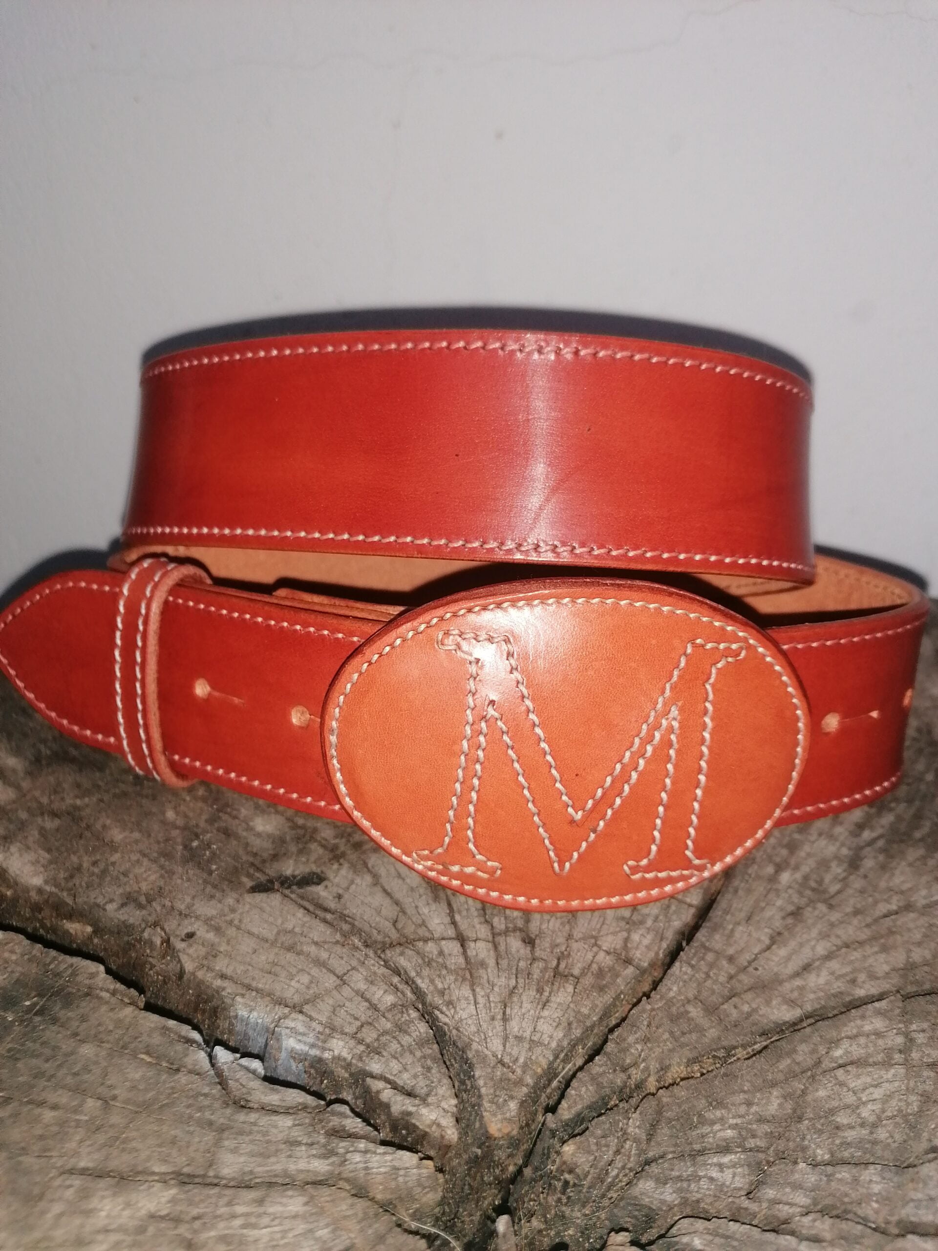 Cinturón cuero cuello de ternera liso con pespunte alrrededor con hevilla chapon forrada y personalizada con iniciales o hierros cosidos