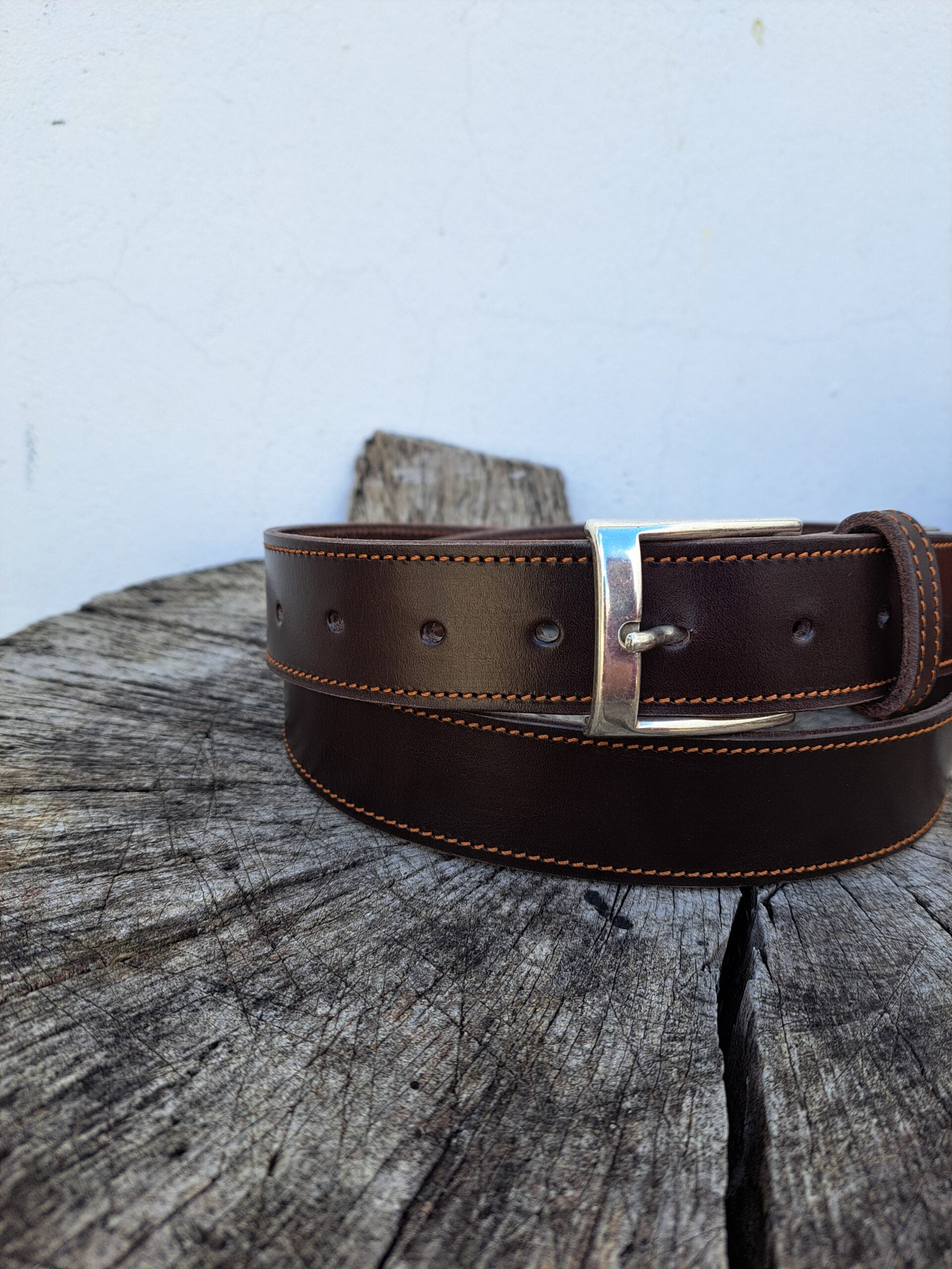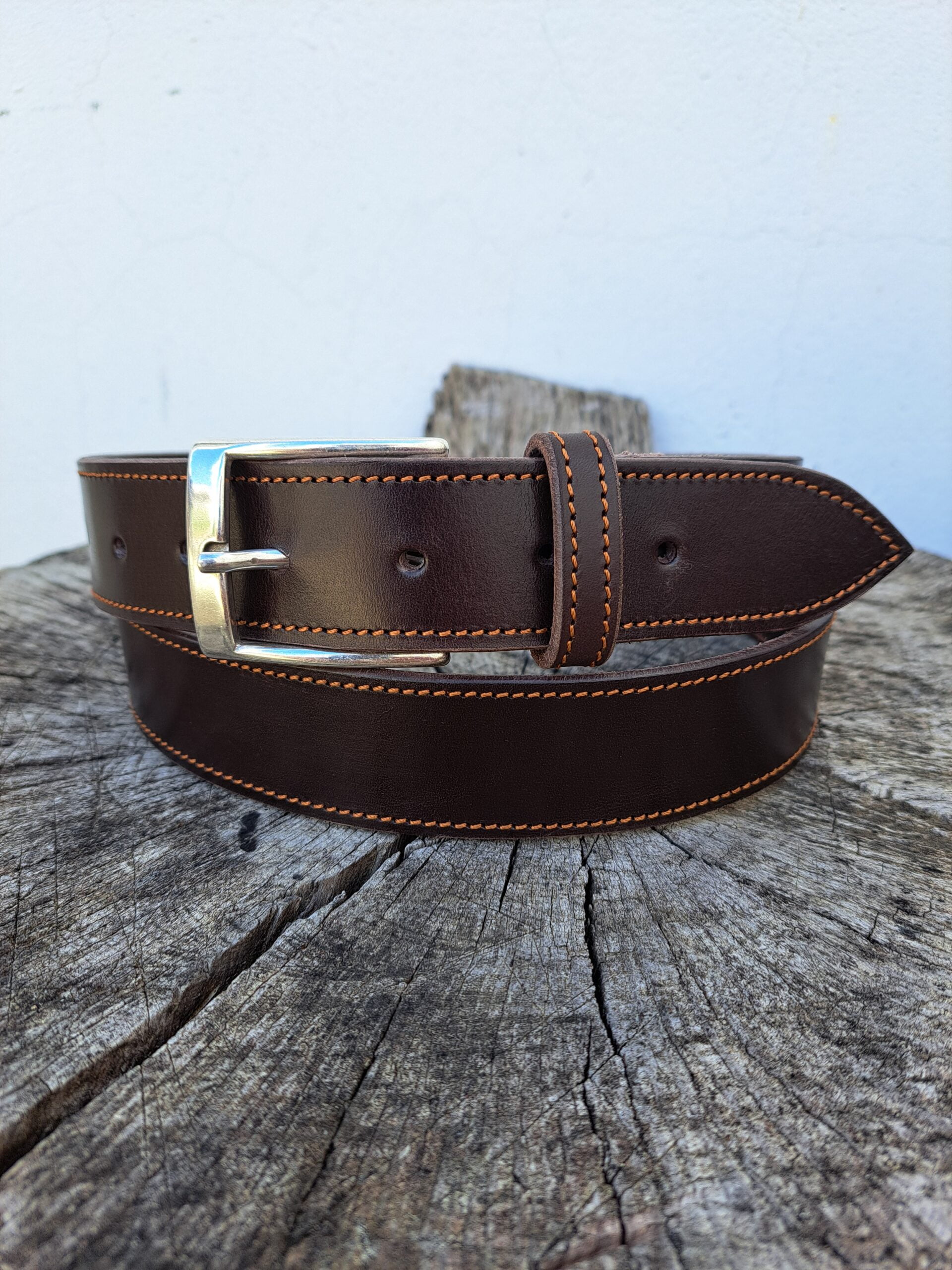 Cinturon hecho en cuero cuello de ternera chocolate 3 mm, cosido con pespunte color ocre