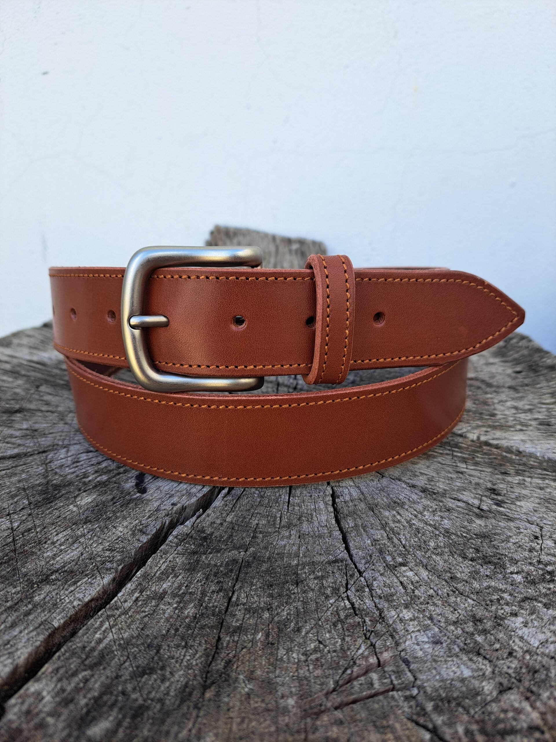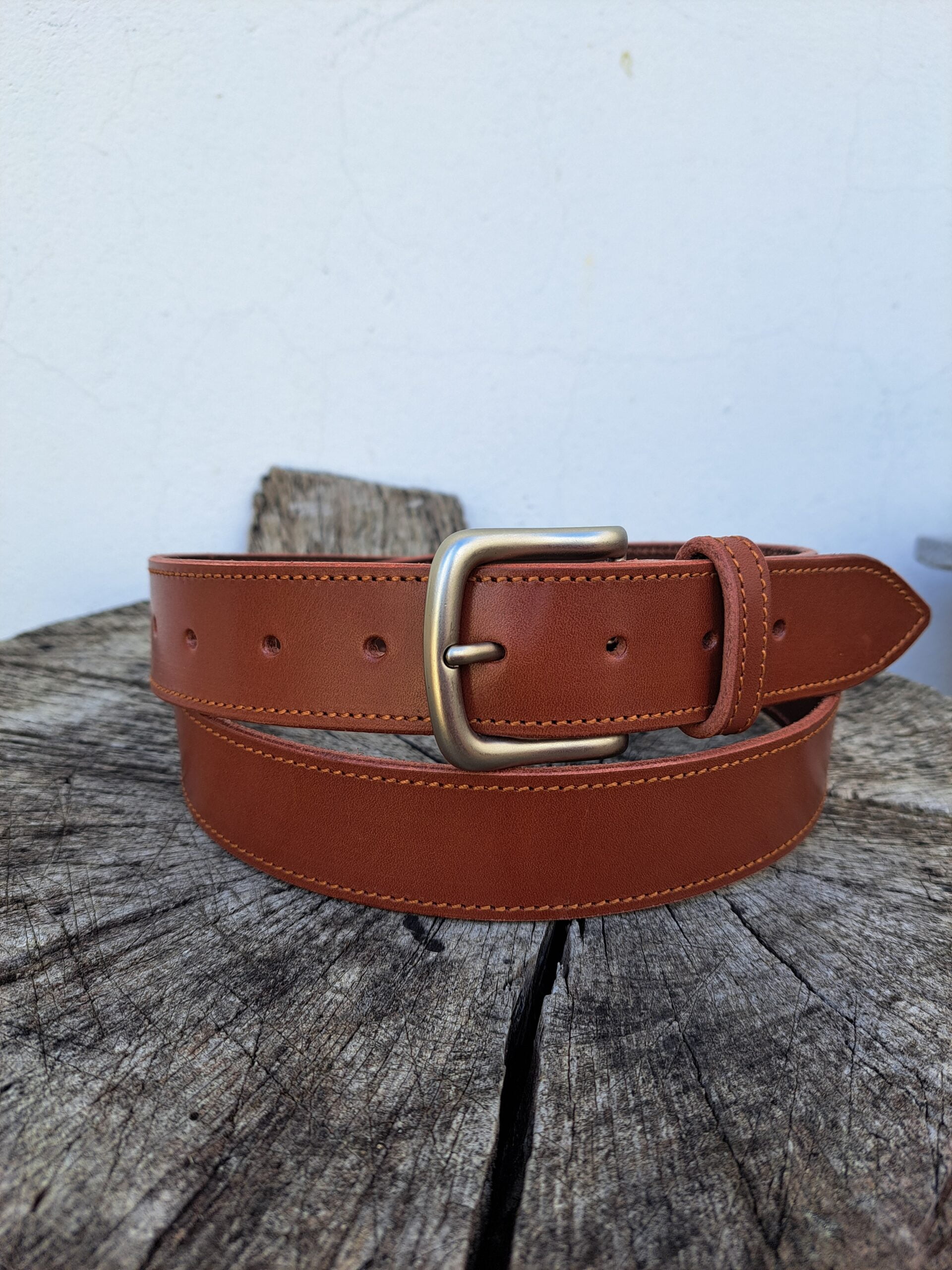 Cinturón hecho en cuero cuello de ternera tostado 3 mm, cosido con pespunte color ocre