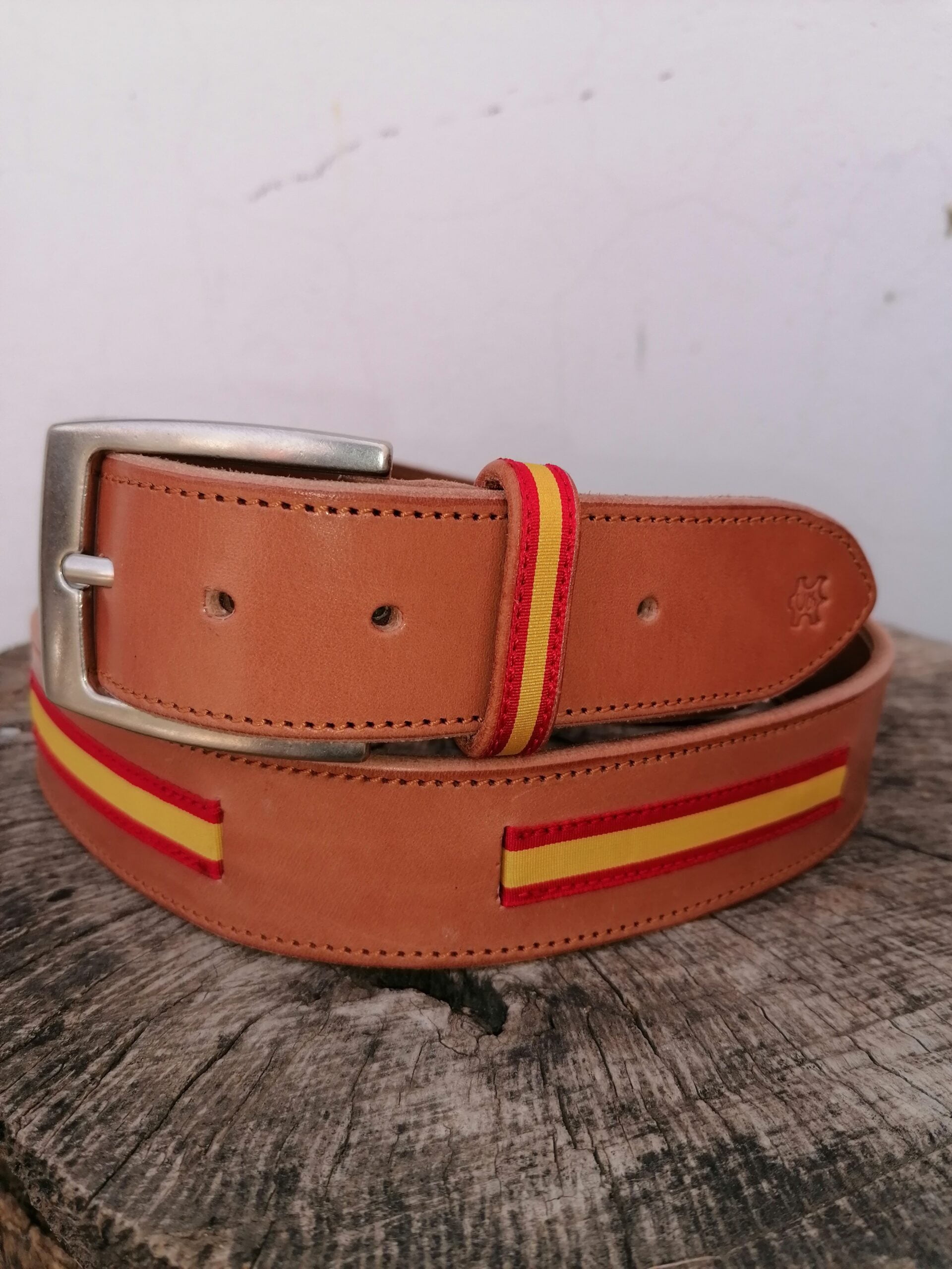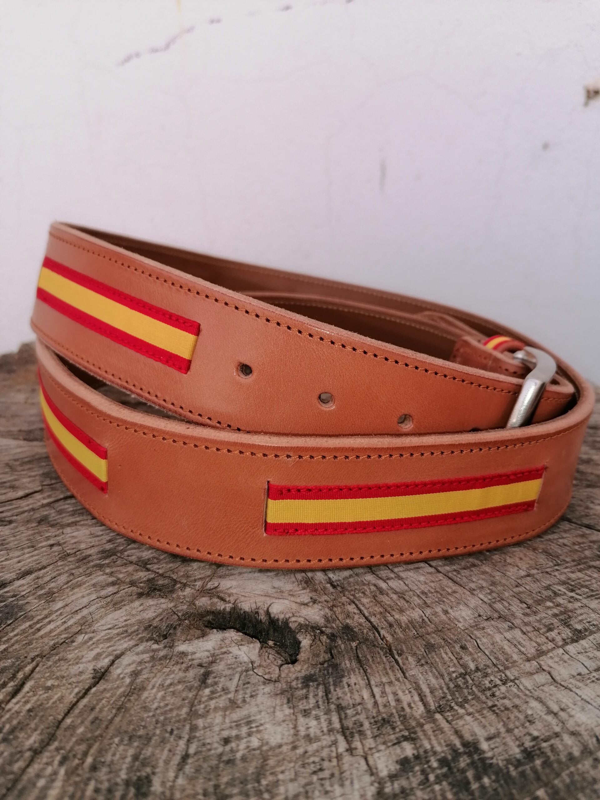 Cinturón color avellana natural con bandera España en cuero cuello ternera 3 mm.